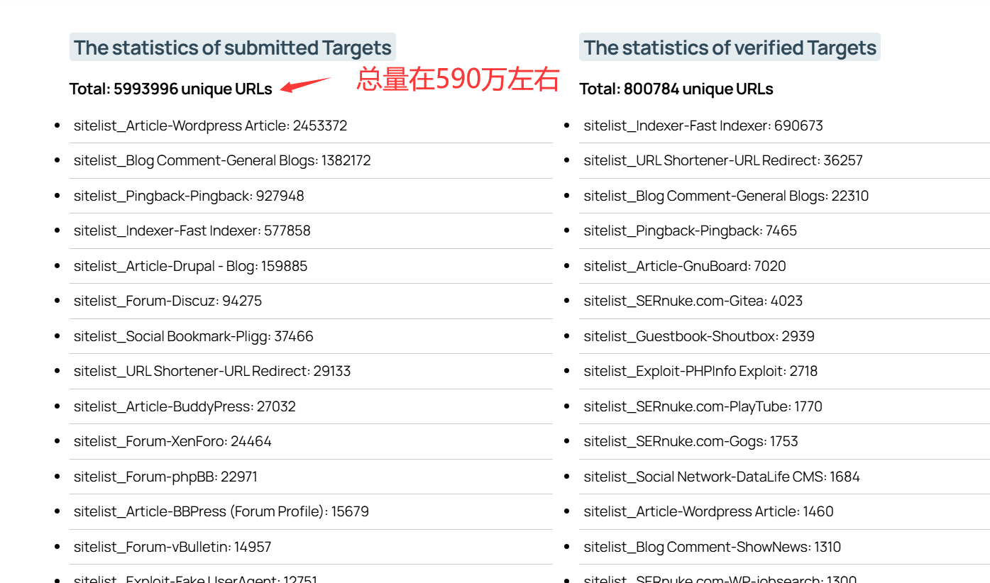 目前GSA SER Lists资源包是2025-10-28更新,资源总量大概在590多万。