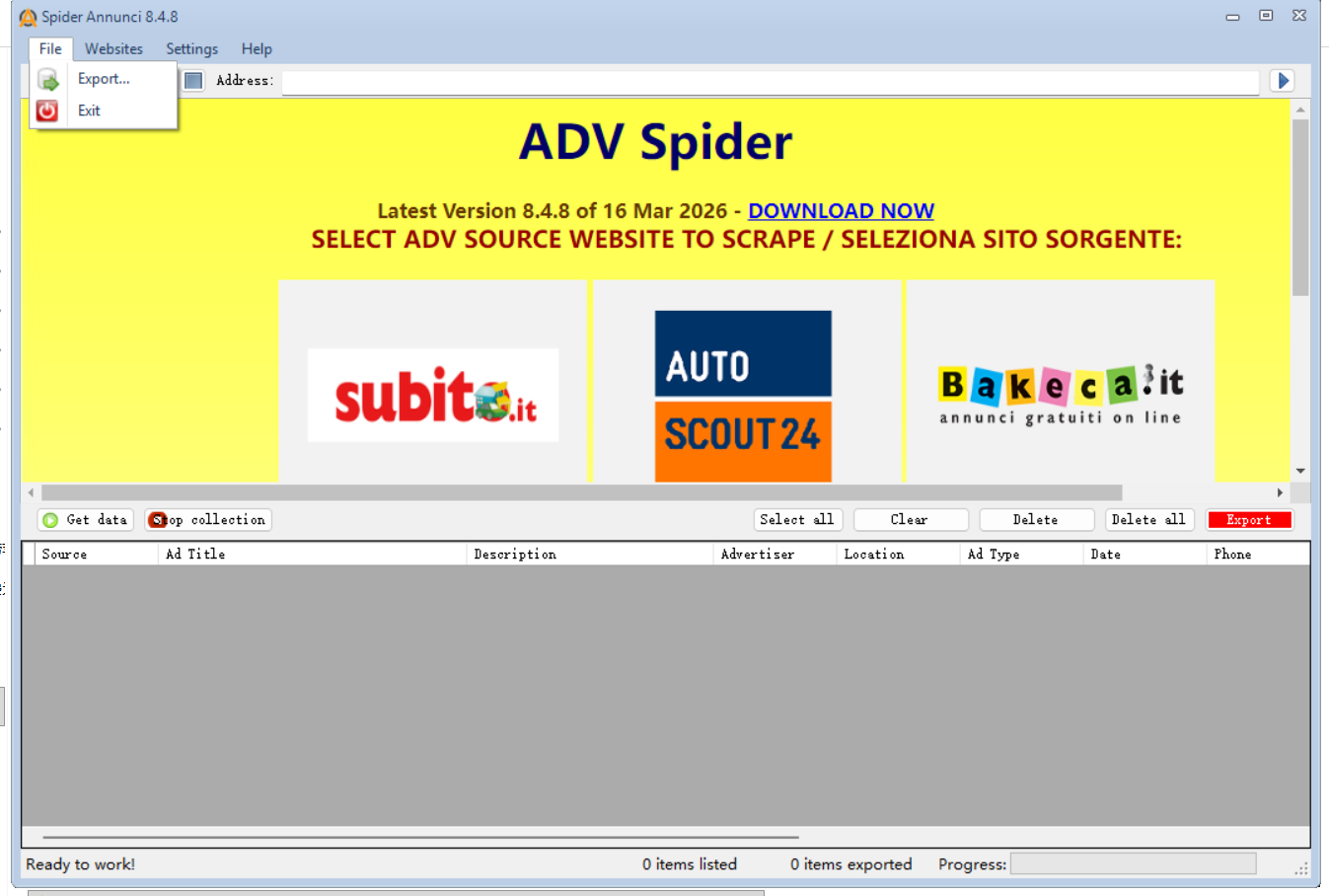 Spider Annunci是一款从广告网站(kijiji易趣广告,bakeca,Subito.it)中提取手机号码,电子邮件和数据的软件。