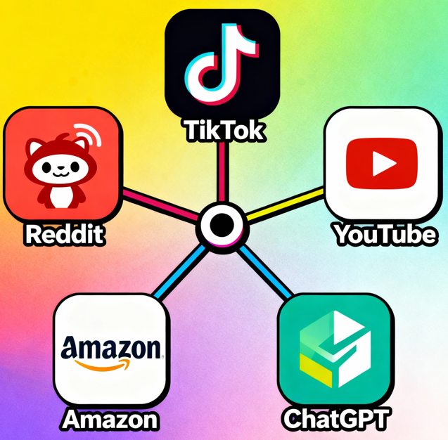 “搜索无处不在”优化要求品牌覆盖所有决策平台,包括但不限于Google、TikTok、Reddit、Amazon、ChatGPT等。每个平台承担不同的心理功能: