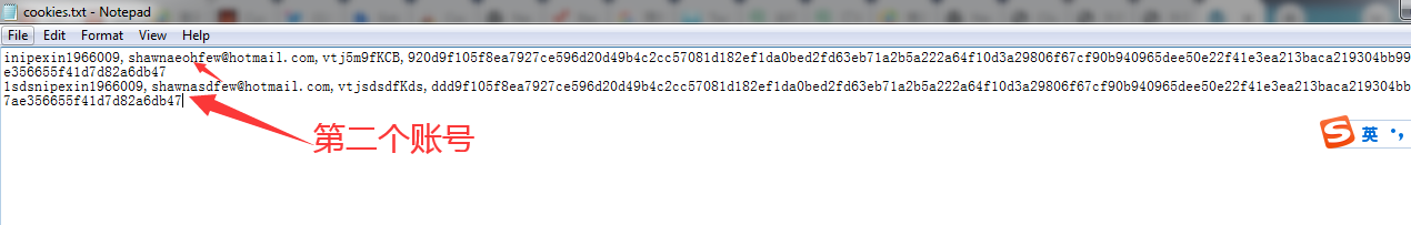 然后我们在D盘(你也可以 在c盘E盘)建立一个名为cookies.txt的文本文件,然后我们在里面依次输入账号名,邮箱,密码,加密的cookies ,他们之间用英文状态下的逗号隔开。