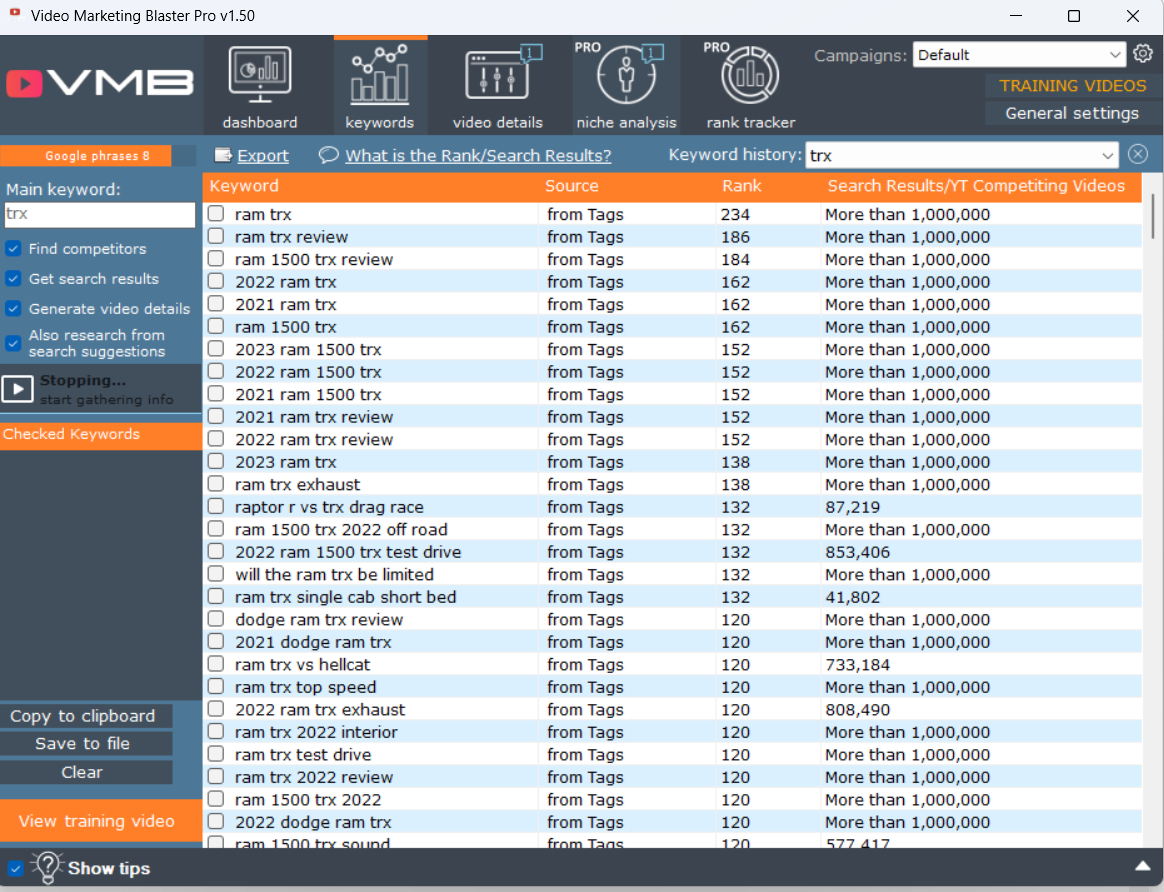 video marketing blaster pro是一款针对Youtube的营销辅助软件,能帮助研究关键词 分析竞争对手 提供视频标题描述优化建议 同时监控相关视频的搜索排名。是针对youtube营销的一个重要的营销助手。